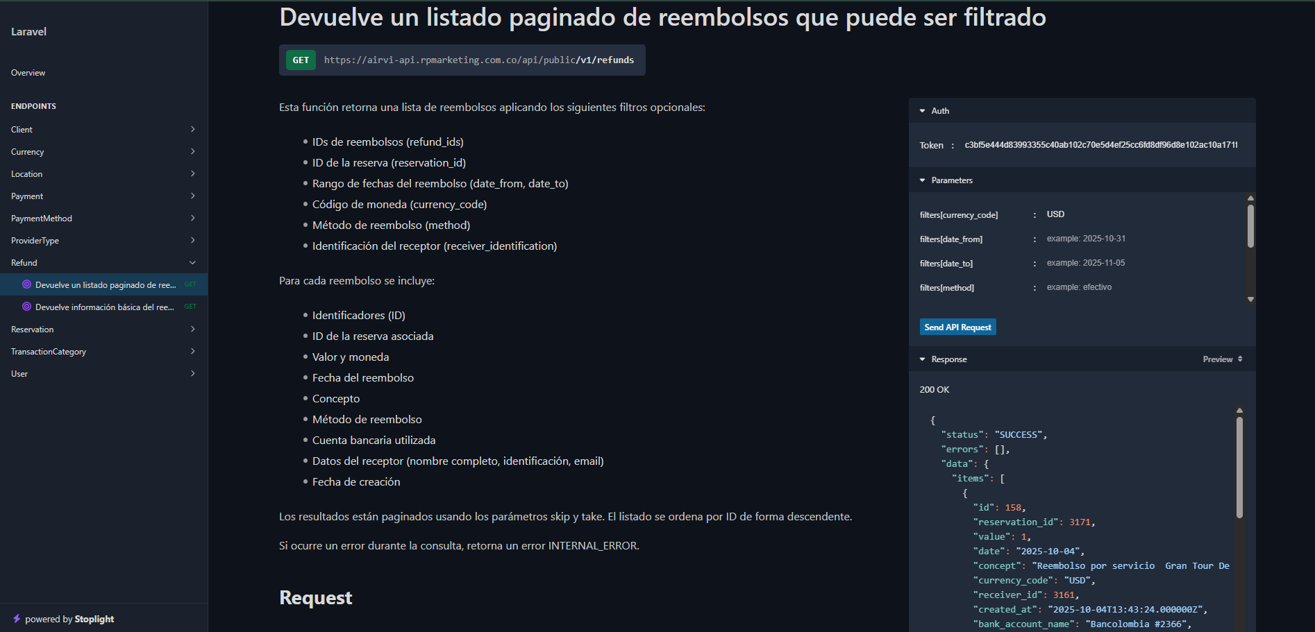 El m贸dulo de reembolsos (Refunds) permiten acceder a los movimientos financieros asociados a reservas. Comparten la misma estructura de autenticaci贸n y respuesta que los m贸dulos anteriores.