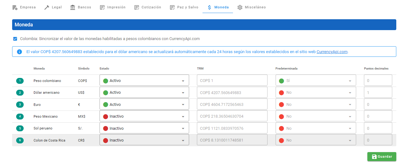 Esta configuración brinda flexibilidad al sistema, permitiendo adaptarse a las preferencias y necesidades comerciales específicas de los clientes. Por defecto, los Pesos colombianos (COP) se establecen como la moneda predeterminada.