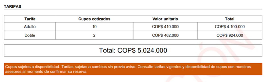 El sistema cuenta con un campo donde puede diligenciar una nota indicando al cliente que los cupos y tarifas de la cotización están sujetos a cambio y disponibilidad.