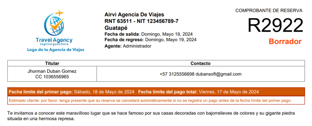 Airvi no tiene la facultad de cancelar una reserva de manera automática; esta acción debe ser realizada por un operador. Sin embargo, se ha añadido un campo especial donde puede ingresar una nota para informar al cliente sobre la eventual cancelación de su reserva si no se realiza el pago antes de la fecha límite, establecida en los campos "Fecha Límite de Pago".
