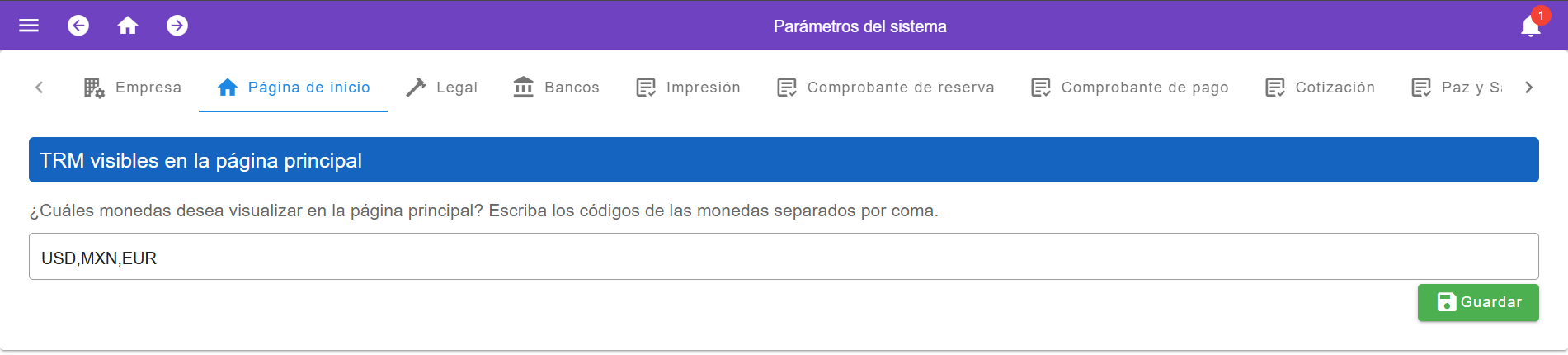 Esta funcionalidad permite agregar o quitar la Tasa Representativa del Mercado (TRM) de diferentes monedas extranjeras, como el D贸lar (USD), Peso Mexicano (MXN), Euro (EUR), Sol Peruano (PEN) y Col贸n de Costa Rica (CRC). Esto facilita la consulta r谩pida de las tasas de cambio directamente desde la p谩gina principal, brindando una herramienta 煤til para la gesti贸n financiera y operativa.