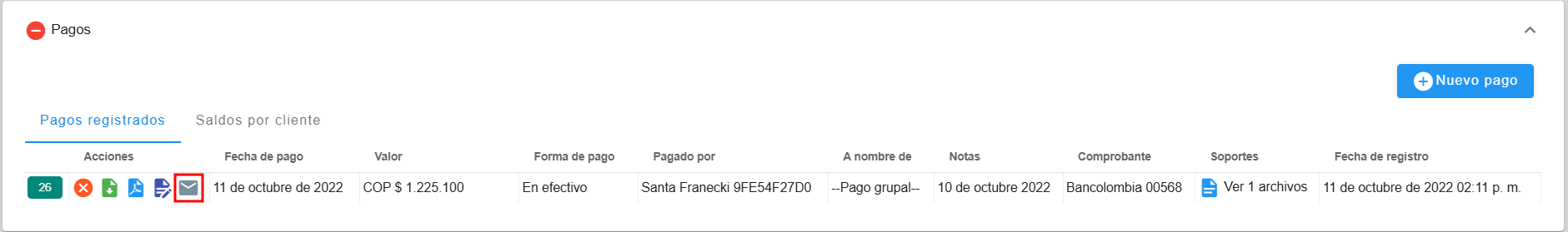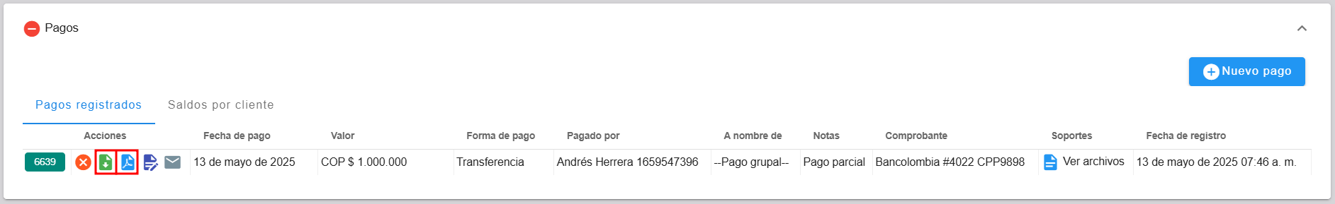 En la secci贸n de Pagos, se registran los abonos realizados por los clientes. El sistema solicitar谩 la fecha del pago, su valor, el nombre del pagador, y si el pago corresponde al grupo o es individual. Tambi茅n se podr谩 adjuntar el comprobante de la transacci贸n y especificar la forma de pago. Adicionalmente, se brinda la opci贸n de agregar notas u observaciones, as铆 como seleccionar la cuenta en la que se ingres贸 el dinero, de forma opcional, y finalmente guardar.