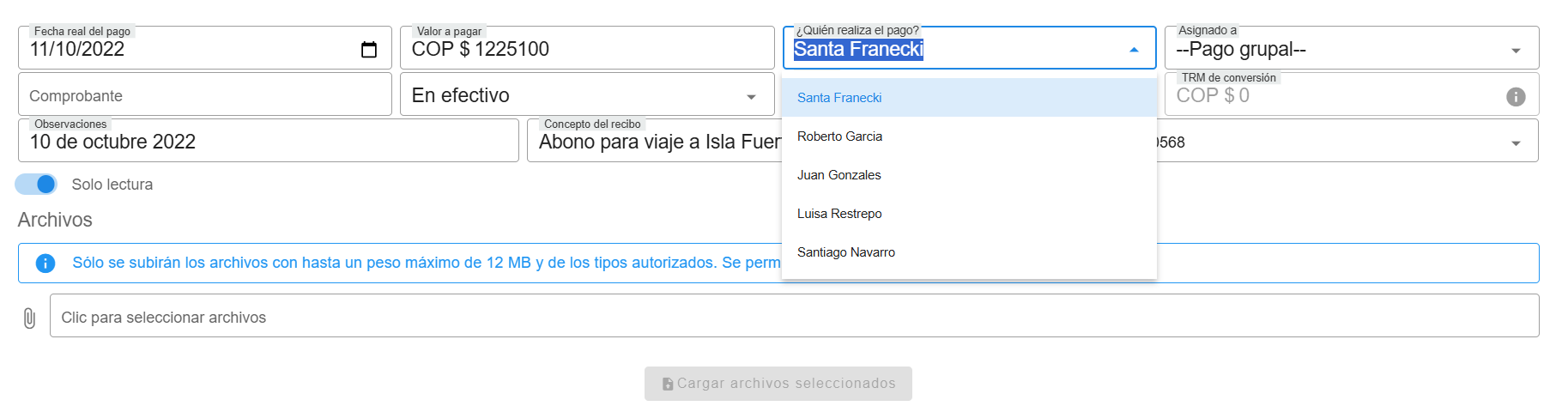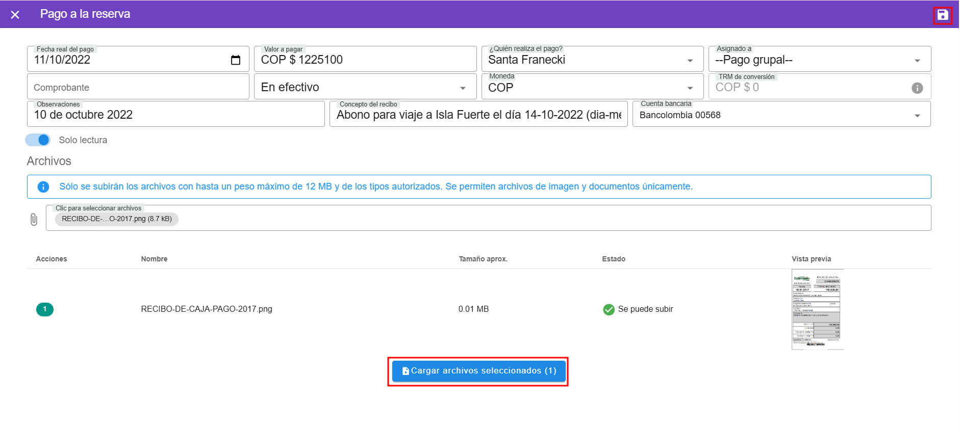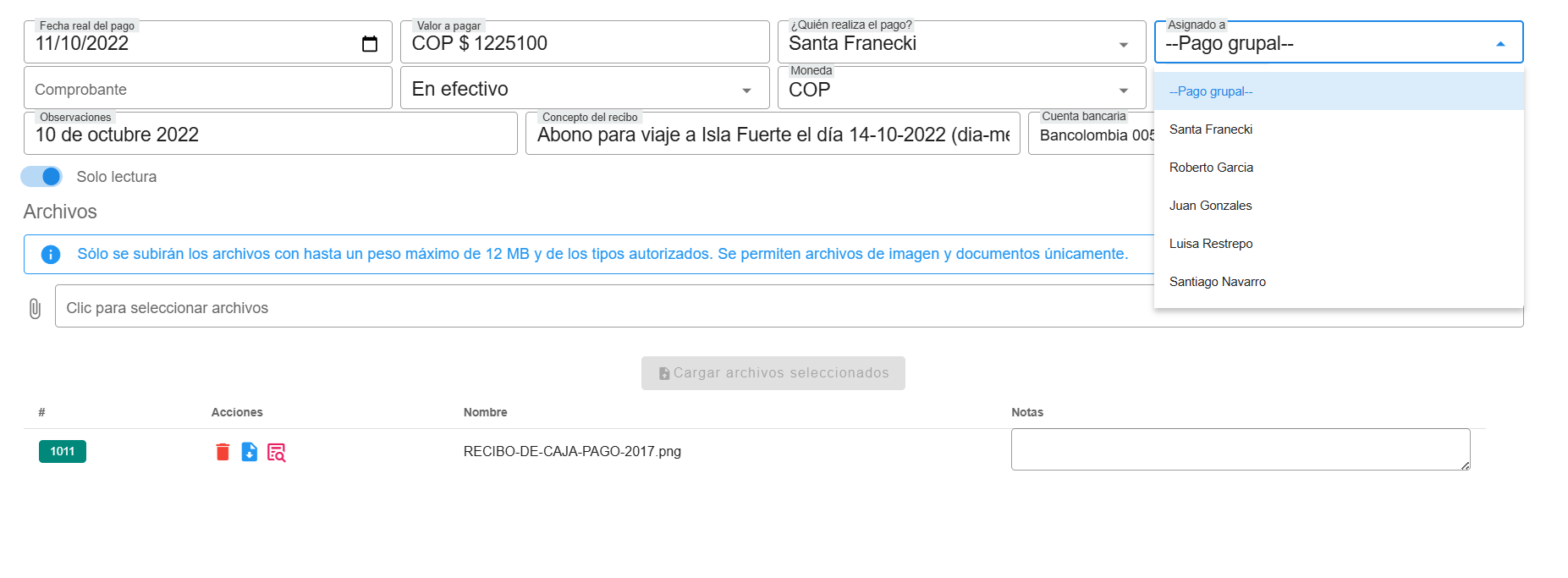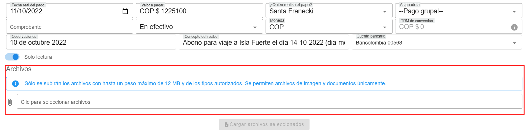 Para agregar archivos a los pagos de una reserva, existen dos maneras. La primera es al editar un pago ya registrado. En la parte inferior del formulario de edici贸n, se habilita la secci贸n "Archivos", donde los usuarios pueden adjuntar documentos relacionados, siempre que cumplan con el l铆mite de tama帽o permitido (12 MB) y el tipo de archivo autorizado (im谩genes o documentos). Esto facilita la gesti贸n y el respaldo de la informaci贸n asociada al pago.