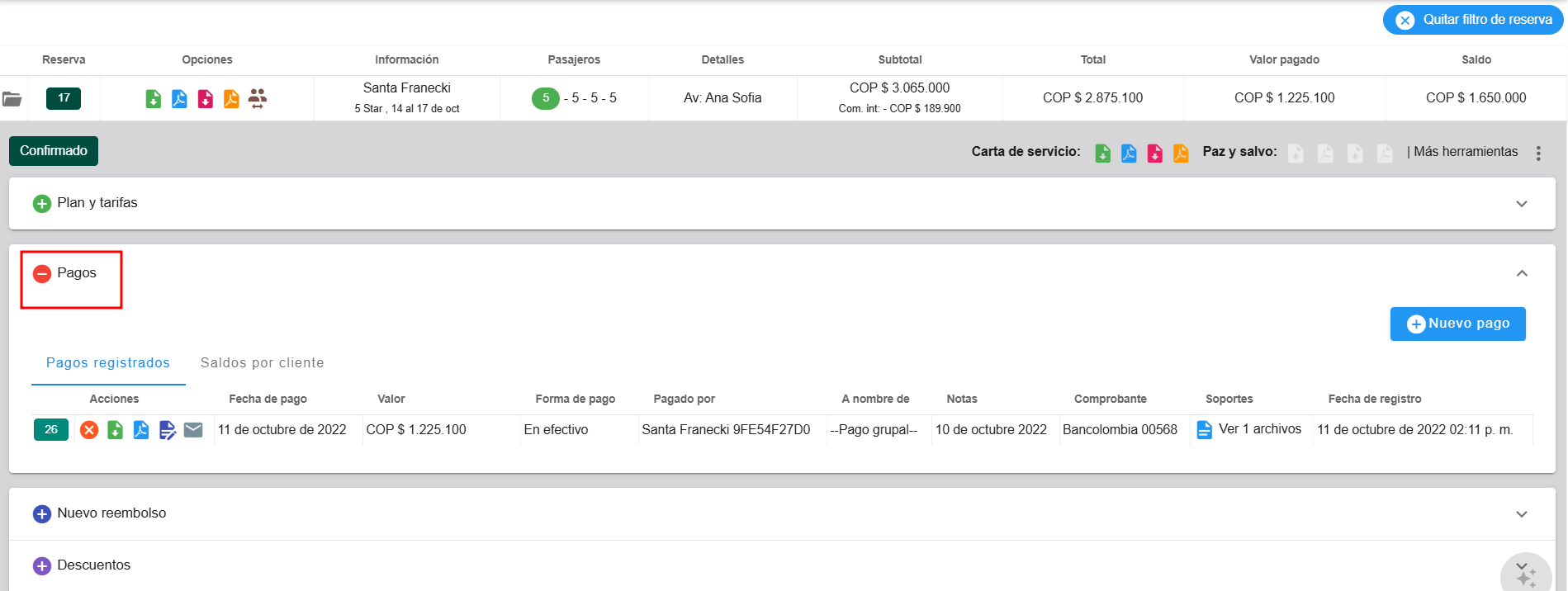 Resumen vigente de estado de pagos de la reserva.