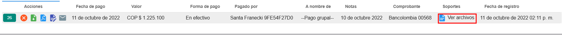 La segunda manera de agregar archivos a los pagos de una reserva es desde el panel de pagos, en la columna "Soportes". Al hacer clic en "Ver archivos", se abrir谩 una ventana que mostrar谩 los archivos previamente cargados, si existen. En esta misma ventana, los usuarios tambi茅n pueden agregar nuevos archivos relacionados con el pago, lo que facilita la gesti贸n y organizaci贸n de los documentos de soporte.