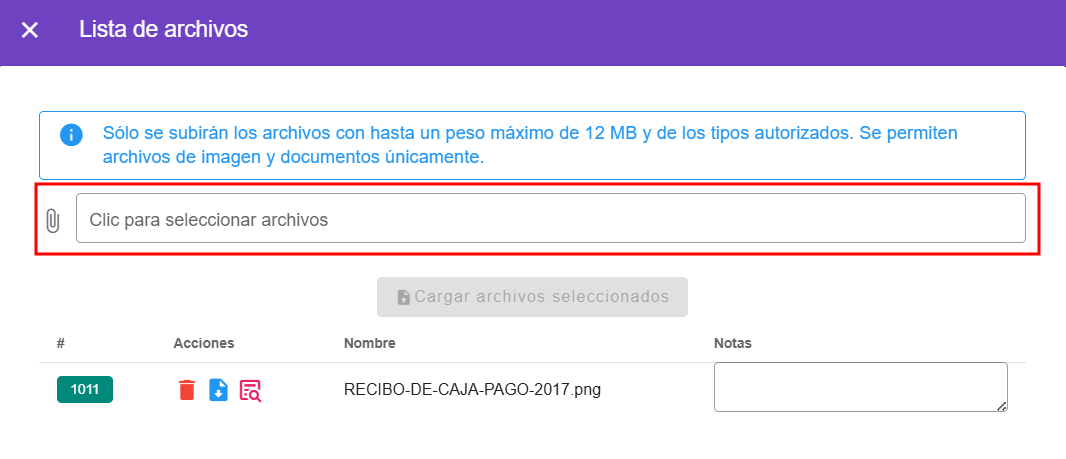 - Para subir el archivo lo puedes hacer dando clic en聽 el clip o en el 谩rea que dice聽Clic para seleccionar archivos