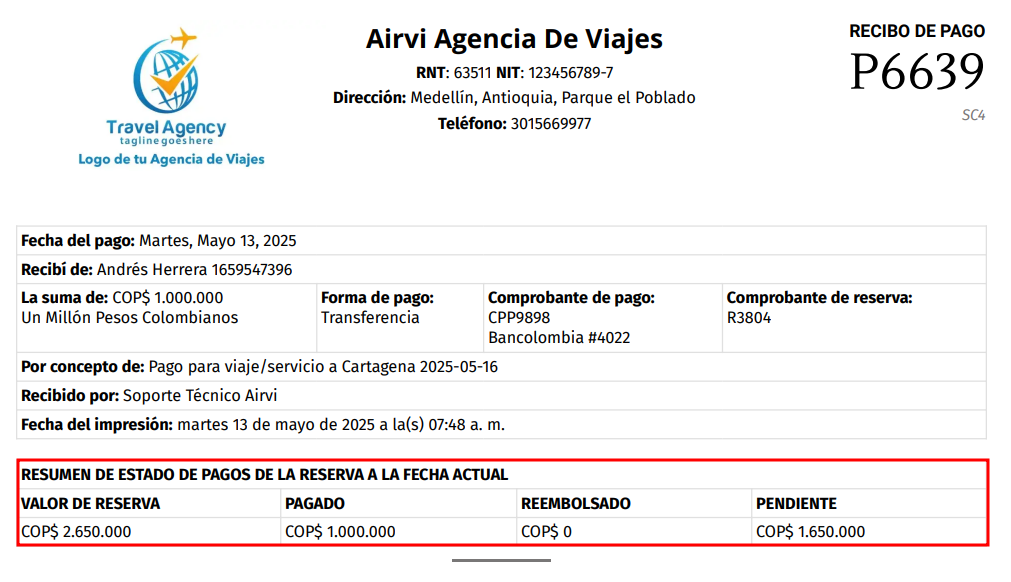 Al momento de visualizar el comprobante de los abonos de los pagos de las reservas, dicho informe cuenta con; el valor total, el pagado, los reembolsos y el valor pendiente por pagar.