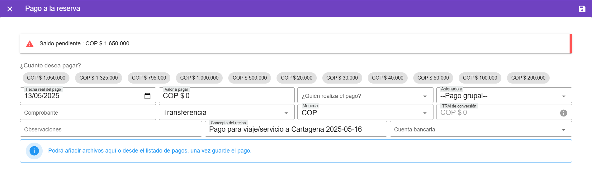 Si el pago es para todo el grupo de viaje, seleccione la opci贸n "--Pago grupal--", lo que indica que el pago ser谩 aplicado al total del grupo.