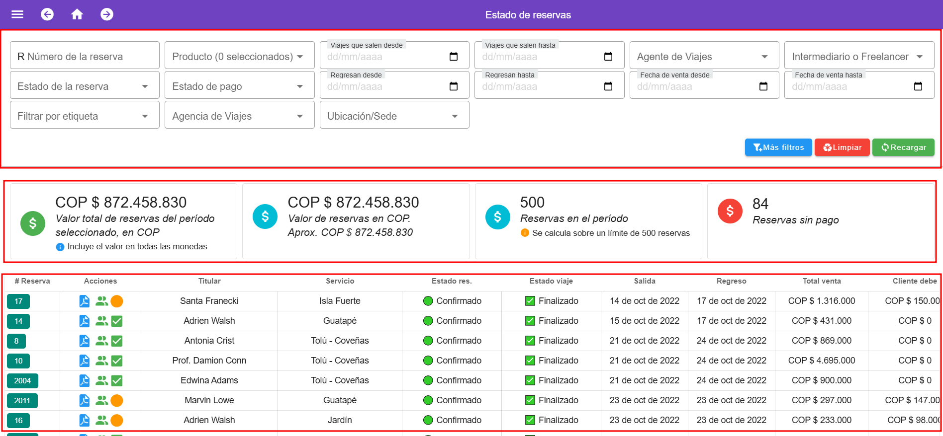 El panel de seguimiento de reservas es el siguiente: