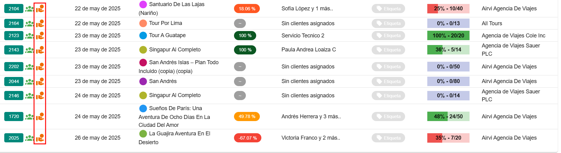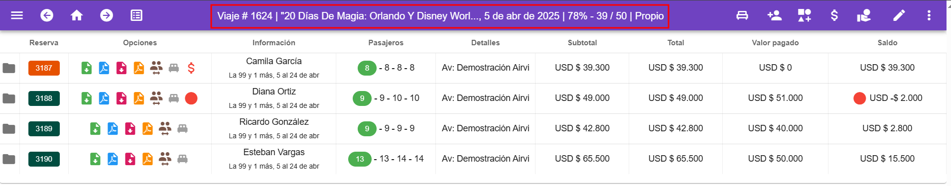 Nota: Al hacer clic en el 铆cono de contabilidad que se encuentra al lado derecho del icono de reserva, se accede directamente al panel de apoyo contable del viaje.