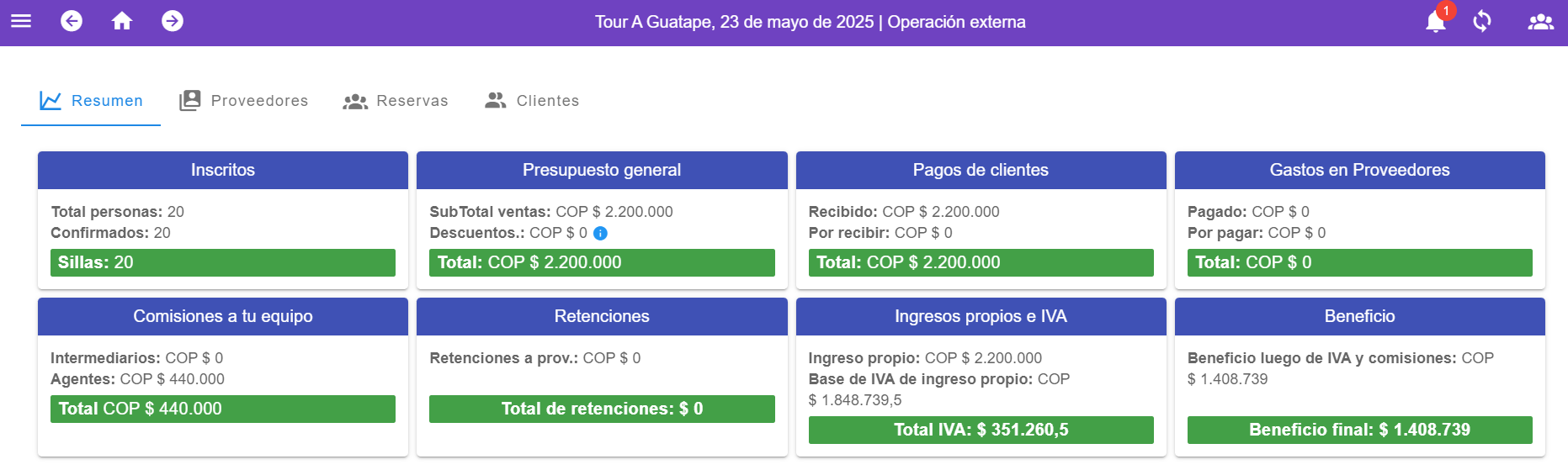 - Avisos y Alertas: Esta secci贸n despliega alertas relacionadas con reservas, proveedores y clientes.