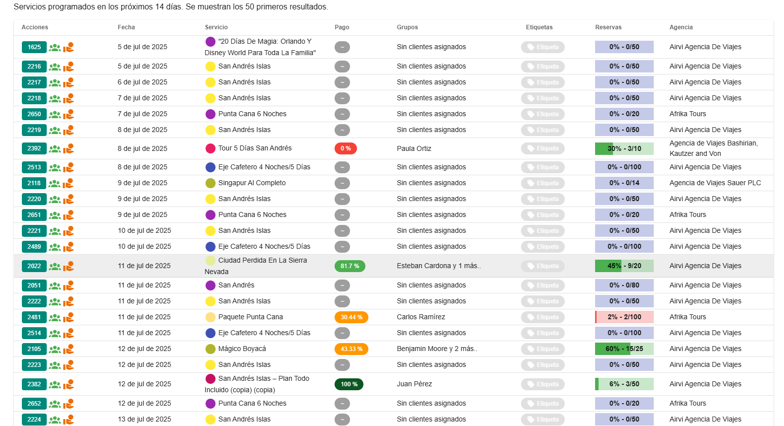 - Estado de los pagos (con porcentaje de pago para todas las reservas asociadas)