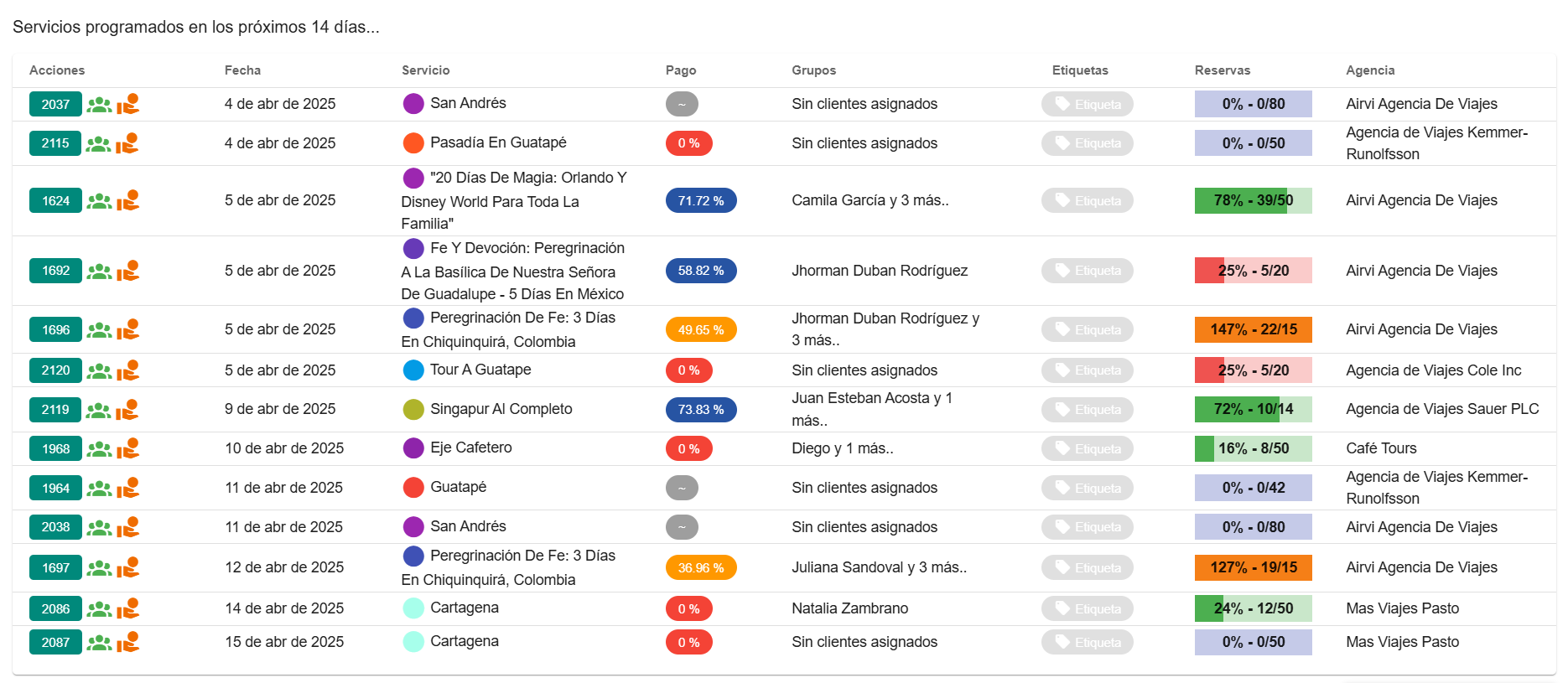 - Estado de los pagos (con porcentaje de pago para todas las reservas asociadas)