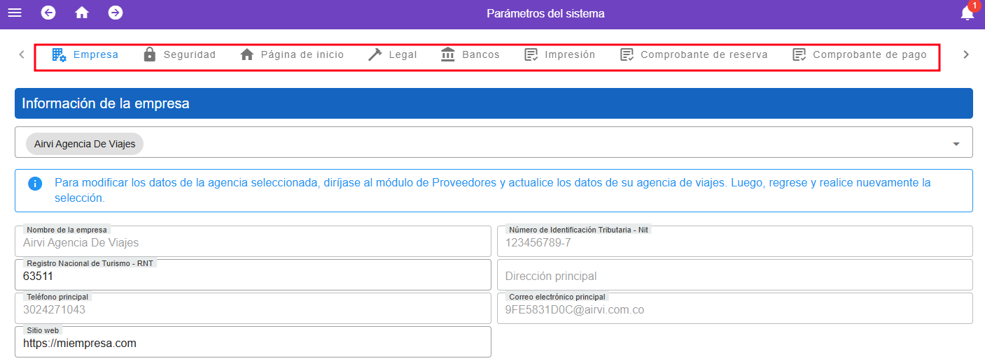 - Empresa: Muestra y permite editar la informaci贸n configurada de la agencia.