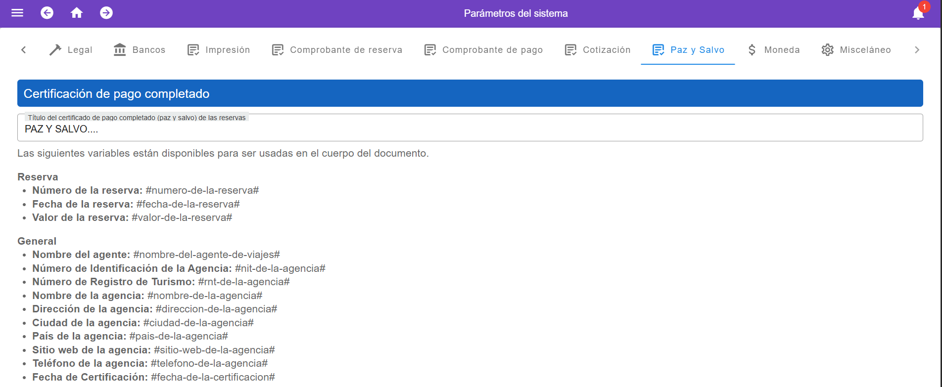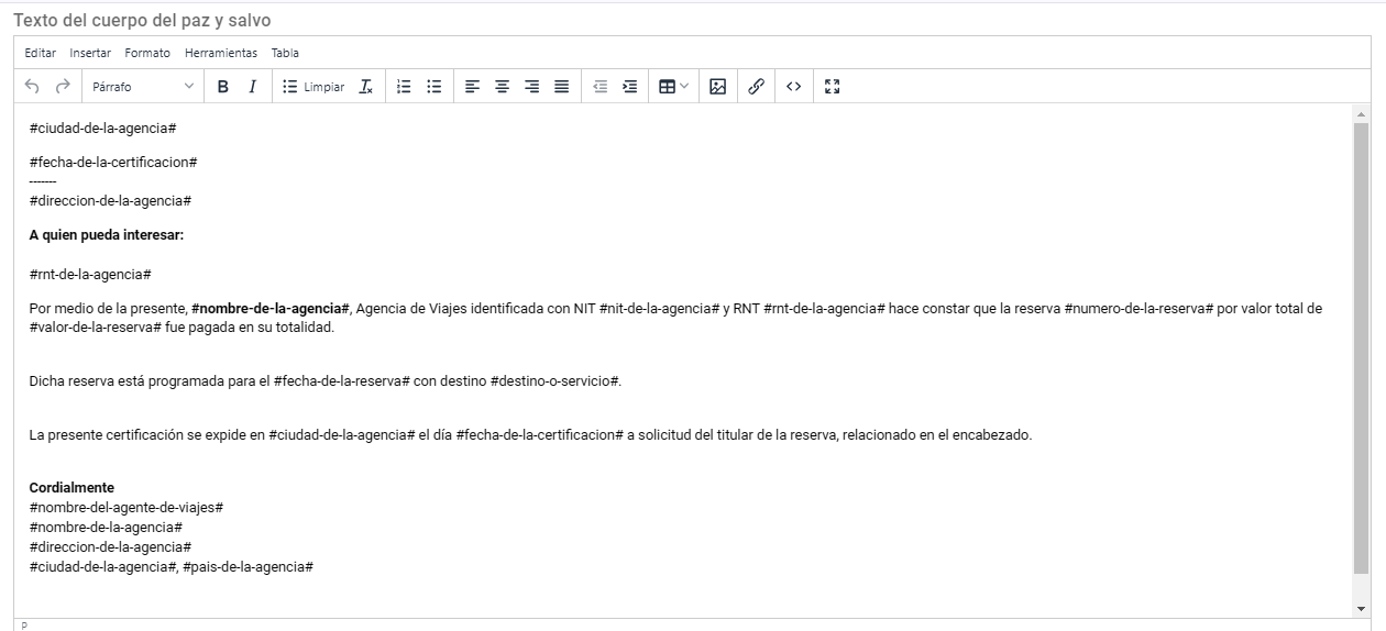 Esta secci贸n permite personalizar el contenido del mensaje para la聽carta de paz y salvo, adapt谩ndolo a las necesidades de la agencia. El dise帽o del texto puede configurarse en dos formatos:聽presentaci贸n est谩ndar聽y聽marca blanca.