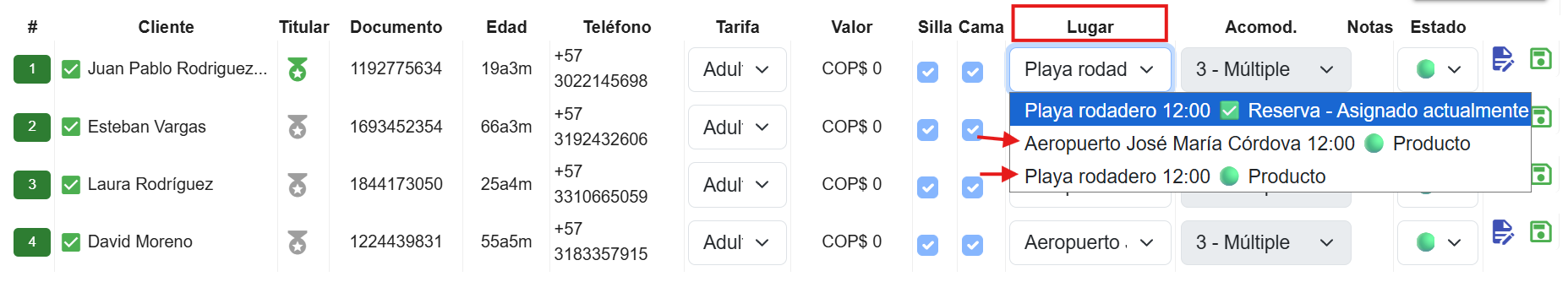 Una vez creada la reserva, se debe ingresar a la sección de clientes y asignar el punto de encuentro correspondiente en la columna “Lugar” para cada pasajero.