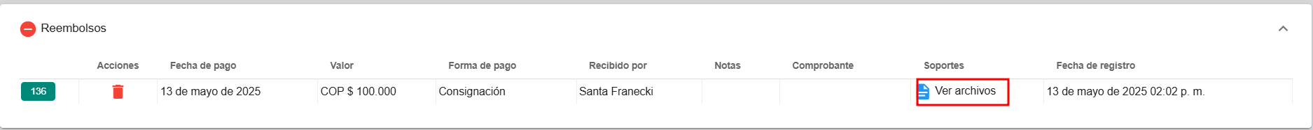 Para agregar archivos a los reembolsos de una reserva es desde el聽panel de reembolsos, en la columna "Soportes". Al hacer clic en "Ver archivos", se abrir谩 una ventana que mostrar谩 los archivos previamente cargados, si existen. En esta misma ventana, los usuarios tambi茅n pueden agregar nuevos archivos relacionados con el pago de reembolsos, lo que facilita la gesti贸n y organizaci贸n de los documentos de soporte.