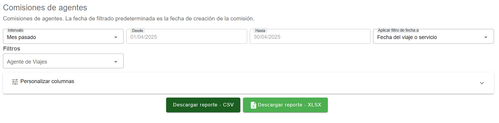 El Reporte de Comisiones de Agentes permite gestionar y analizar las comisiones generadas por cada agente de viajes durante un periodo específico, garantizando un control claro y preciso de las compensaciones. Los usuarios pueden definir el periodo de consulta aplicando filtros por fecha de creación de la comisión o fecha del viaje o servicio, adaptando la visualización de acuerdo a sus necesidades.