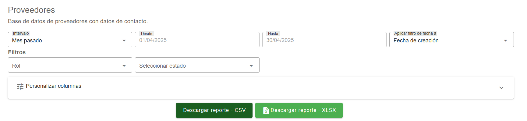 El Reporte de Proveedores proporciona acceso a una base de datos completa de proveedores registrados en la plataforma, incluyendo informaci贸n de contacto y datos comerciales. Los usuarios pueden definir el periodo de consulta aplicando filtros por fecha de creaci贸n, permitiendo analizar los proveedores registrados en un intervalo espec铆fico. Adem谩s, se pueden aplicar filtros adicionales por rol del proveedor y estado, facilitando la segmentaci贸n de la informaci贸n. Este reporte es 煤til para mantener un control actualizado de los proveedores activos, verificar informaci贸n de contacto y evaluar el estado de los acuerdos comerciales. Los datos se pueden exportar en formatos como Excel o PDF para su an谩lisis y documentaci贸n.