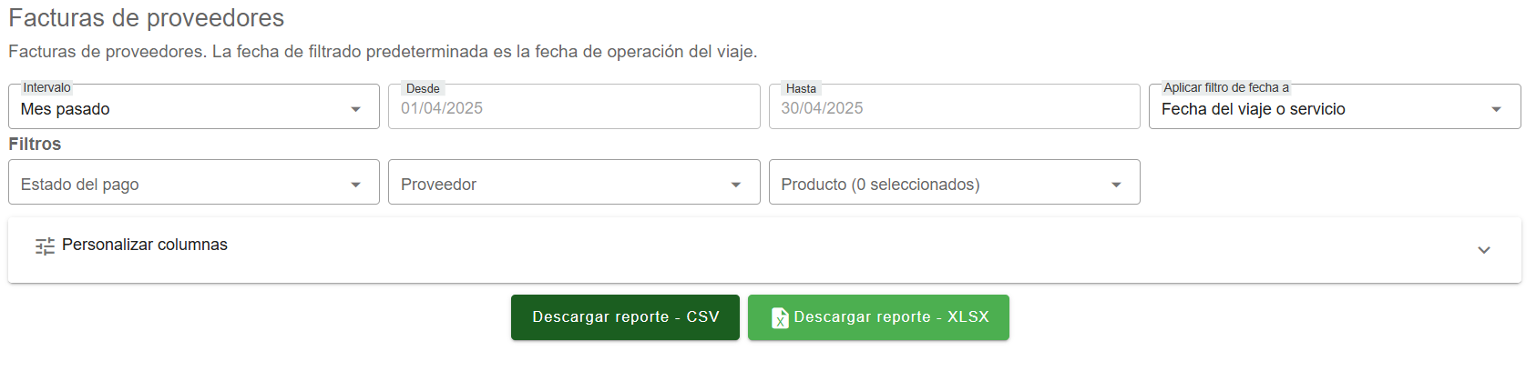El Reporte de Facturas de Proveedores permite consultar las facturas emitidas por los proveedores en un periodo espec铆fico, facilitando el control de los pagos pendientes y el seguimiento de las obligaciones financieras de la agencia. Los usuarios pueden definir el periodo de consulta aplicando filtros por la fecha del viaje o servicio, adaptando el reporte a las necesidades espec铆ficas de revisi贸n. En este reporte se visualiza informaci贸n como el n煤mero de registro, estado de la factura, fecha de registro, fecha de vencimiento, proveedor, servicio cobrado, total a pagar en COP y moneda extranjera, valor de comisi贸n, retenci贸n aplicada y pagos realizados. Adem谩s, el reporte permite aplicar filtros por estado del pago, proveedor y producto, ofreciendo una visi贸n clara y segmentada de las obligaciones con proveedores. Los datos pueden ser exportados para su an谩lisis y documentaci贸n en formatos como Excel o PDF, siendo una herramienta clave para gestionar las cuentas por pagar y mantener un control financiero adecuado.