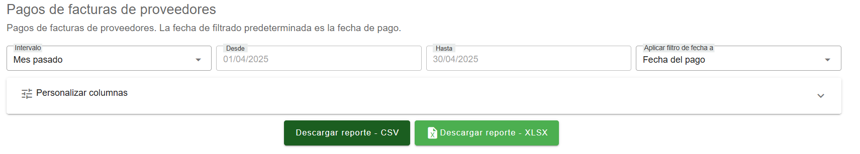 El Reporte de Pagos de Facturas de Proveedores permite visualizar los pagos realizados a proveedores en un periodo espec铆fico, ofreciendo un control claro sobre las obligaciones financieras cumplidas. Los usuarios pueden definir el periodo de consulta aplicando filtros por fecha de pago, lo que facilita revisar pagos realizados en intervalos espec铆ficos. El reporte muestra informaci贸n como el n煤mero de factura, proveedor, fecha de pago, monto pagado, moneda, forma de pago y estado del pago. Adem谩s, se pueden aplicar filtros adicionales por proveedor y estado del pago, permitiendo un an谩lisis m谩s detallado. Los datos pueden ser exportados para su seguimiento contable y documentaci贸n en formatos como Excel o PDF. Este reporte es esencial para garantizar una correcta gesti贸n de pagos a proveedores y mantener un control financiero adecuado.聽
