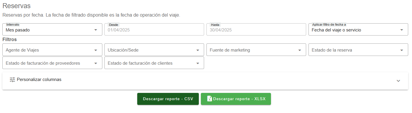 Este reporte permite consultar todas las reservas generadas en un periodo de tiempo determinado, utilizando como referencia la fecha de viaje del servicio. Es 煤til para hacer seguimiento operativo y comercial, ya que muestra informaci贸n clave como n煤mero de reserva, agente de viajes, titular, destino, pasajeros, valor total, estado de la reserva, forma de pago, descuentos, notas administrativas y m谩s. Adem谩s, el sistema permite filtrar los datos por ubicaci贸n/sede, fuente de marketing, estado de facturaci贸n (clientes y proveedores), e incluso por intermediarios o freelancers. El usuario puede personalizar qu茅 columnas desea incluir en el reporte y exportar la informaci贸n en formato CSV o Excel para su an谩lisis o consolidaci贸n contable.
