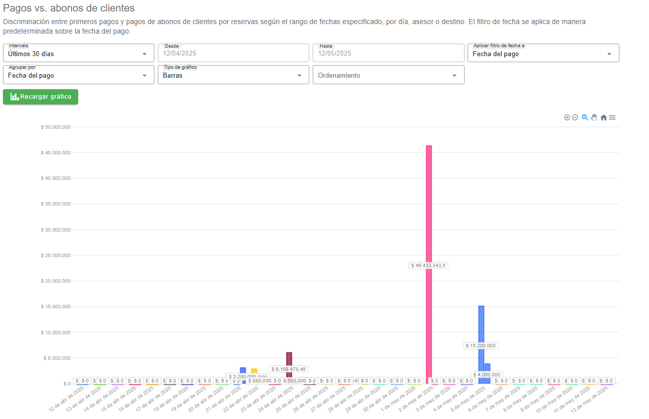 Este gráfico ofrece la opción de agrupar los datos por fecha del pago, permitiendo analizar la evolución de los ingresos recibidos, ya sea como pagos iniciales o como abonos posteriores. Los usuarios también pueden aplicar filtros por asesor, destino u otros parámetros, brindando una visión más específica.