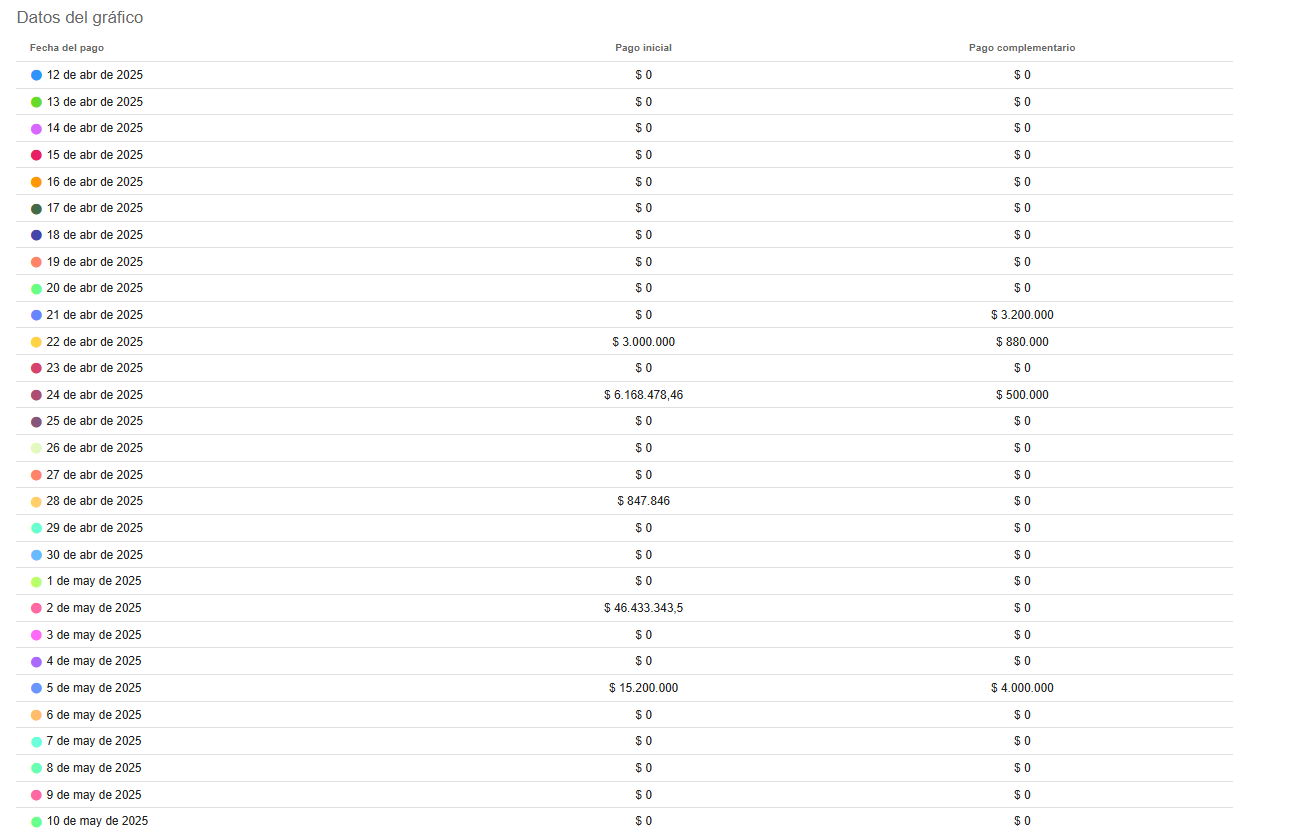 En la parte inferior del gráfico, se encuentra un resumen de datos que muestra la cantidad y el valor de los pagos iniciales y abonos realizados. Esto facilita un análisis comparativo y permite identificar patrones de pago entre los clientes.