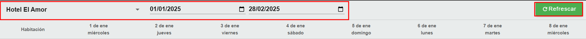 Permite visualizar de forma clara la ocupaci贸n de las habitaciones de los hoteles para un rango de fechas espec铆fico. Est谩 dise帽ado para brindar a los usuarios una experiencia intuitiva y eficaz al momento de ver cu谩les habitaciones tienen reservas.
