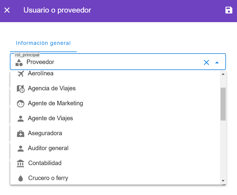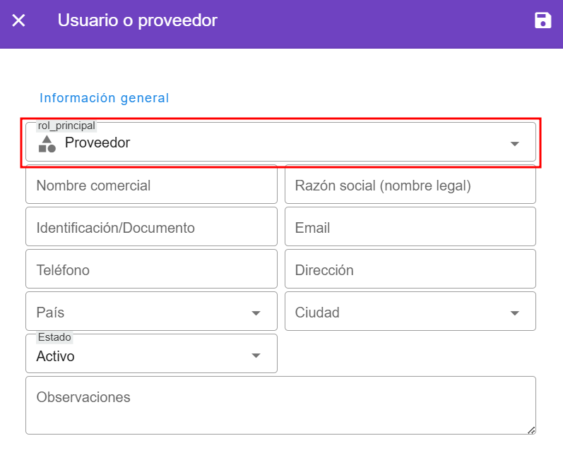 - Seleccionar el rol: Establece si el registro corresponde a un usuario o un proveedor.