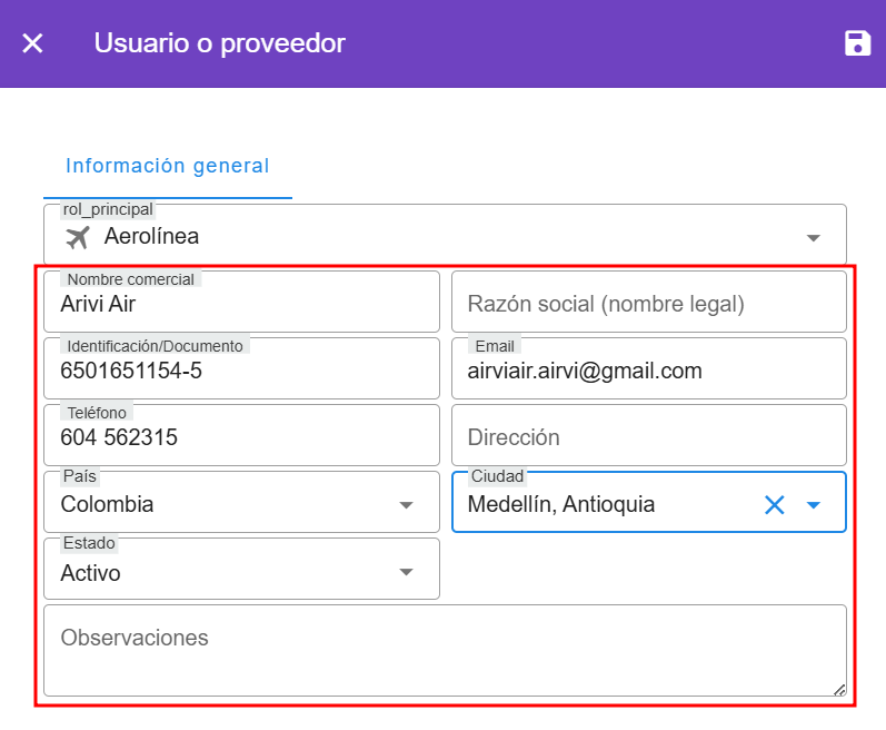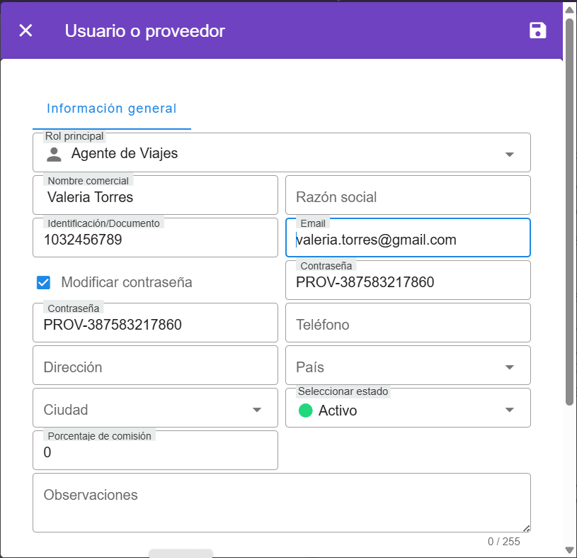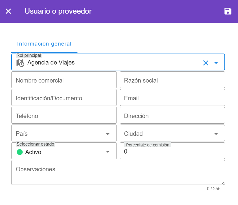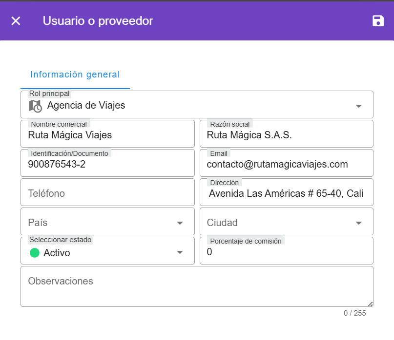 4. Diligenciar la informaci贸n requerida: Completar los datos necesarios seg煤n el rol asignado. En este caso para el agencia de viajes, los campos Obligatorios son el Nombre y el Tel茅fono
