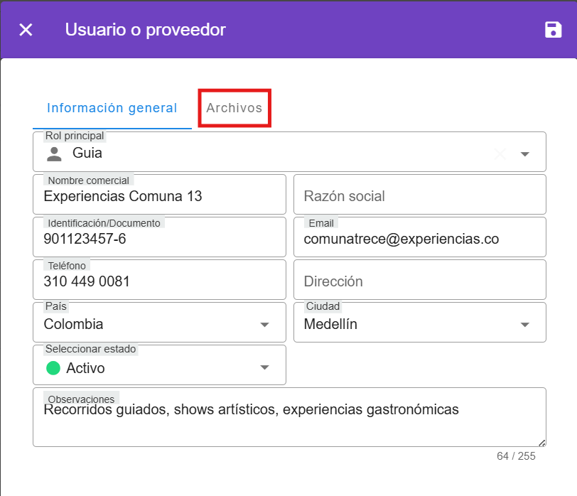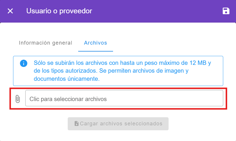 2. Hacer clic en el apartado de "Archivos" ubicado en la parte superior izquierda de la ventana de usuarios y proveedores