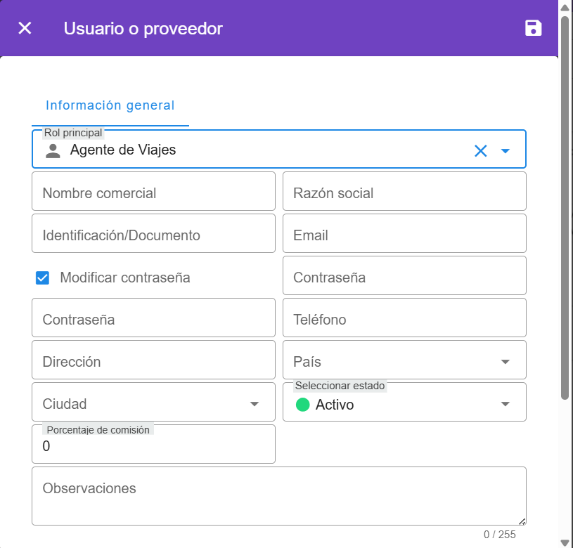 4. Diligenciar la informaci贸n requerida: Completar los datos necesarios seg煤n el rol asignado. En este caso para el agente de viajes, los campos Obligatorios son el Nombre y el Tel茅fono