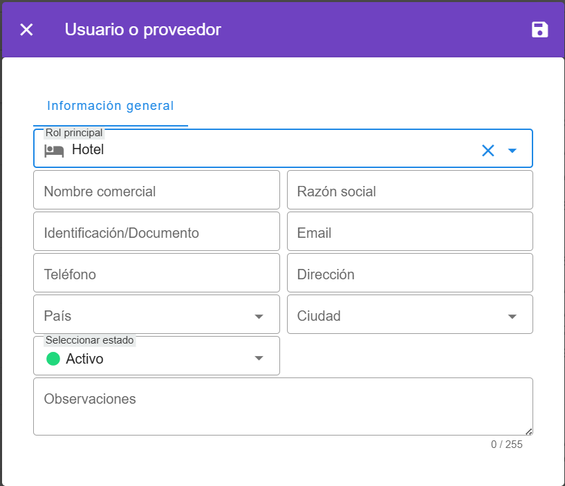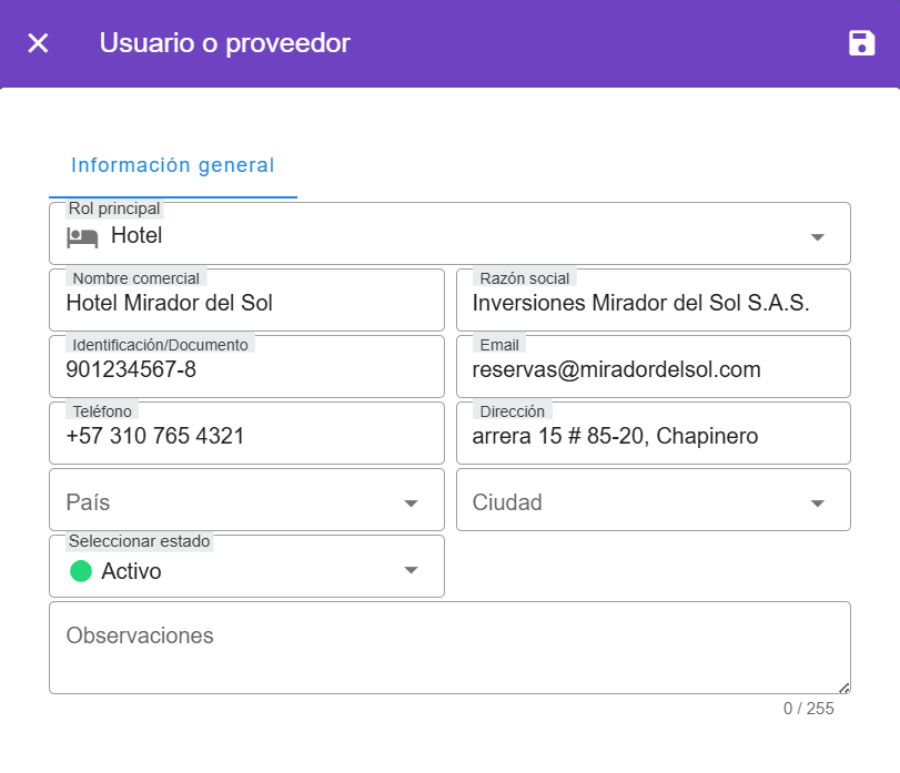 4. Diligenciar la informaci贸n requerida: Completar los datos necesarios seg煤n el rol asignado. En este caso para el Hotel , los campos Obligatorios son el Nombre
