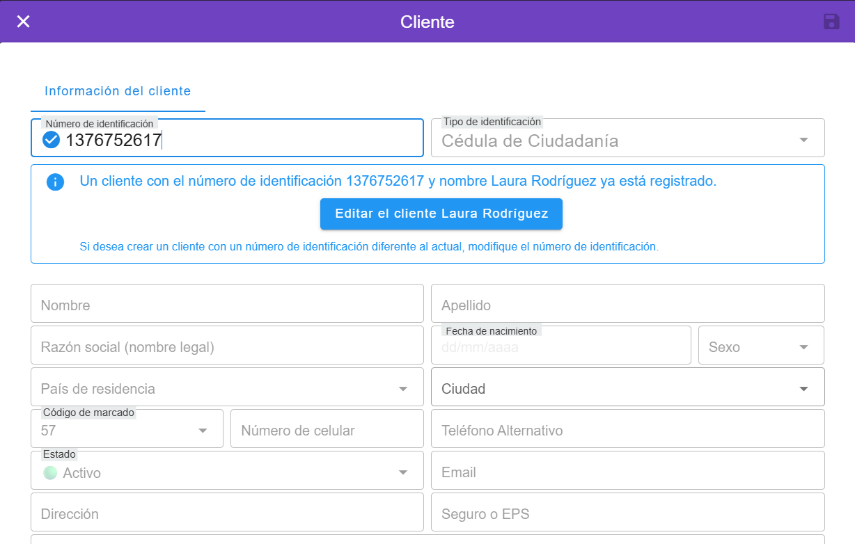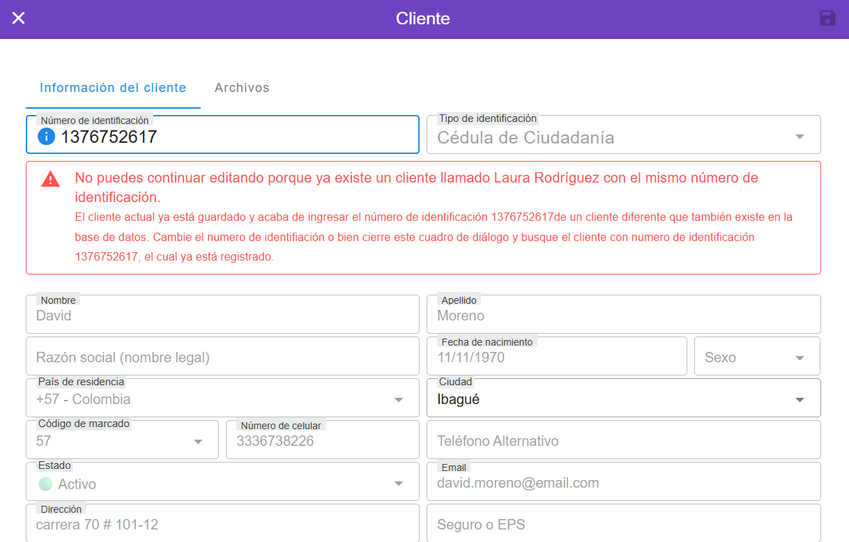 Al crear un nuevo cliente, se verifica si el cliente ya existe en el momento de ingresar el número de documento. Asimismo, al modificar un cliente ya registrado, el sistema verificará si el documento de identificación ingresado pertenece a un cliente existente. Esto previene la duplicidad de información y errores de diligenciamiento.