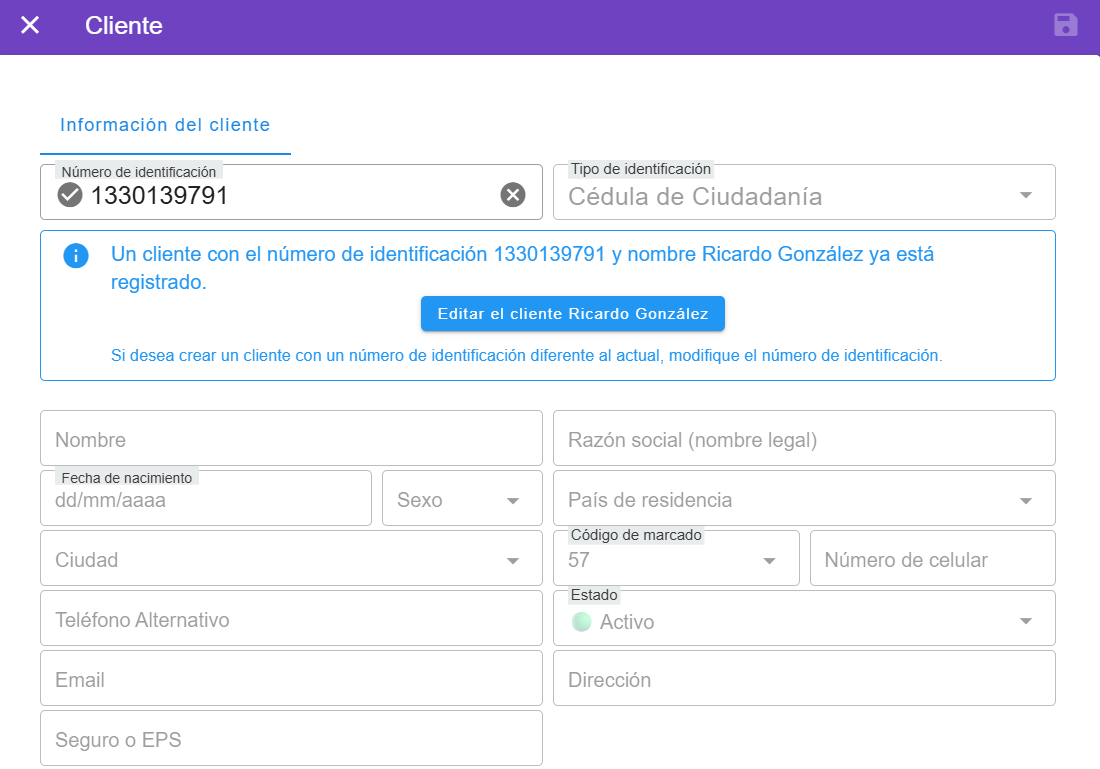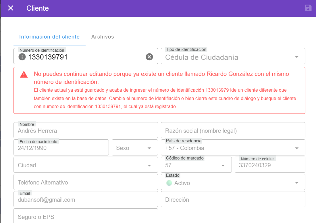 Al crear un nuevo cliente, se verifica si el cliente ya existe en el momento de ingresar el n煤mero de documento. Asimismo, al modificar un cliente ya registrado, el sistema verificar谩 si el documento de identificaci贸n ingresado pertenece a un cliente existente. Esto previene la duplicidad de informaci贸n y errores de diligenciamiento.