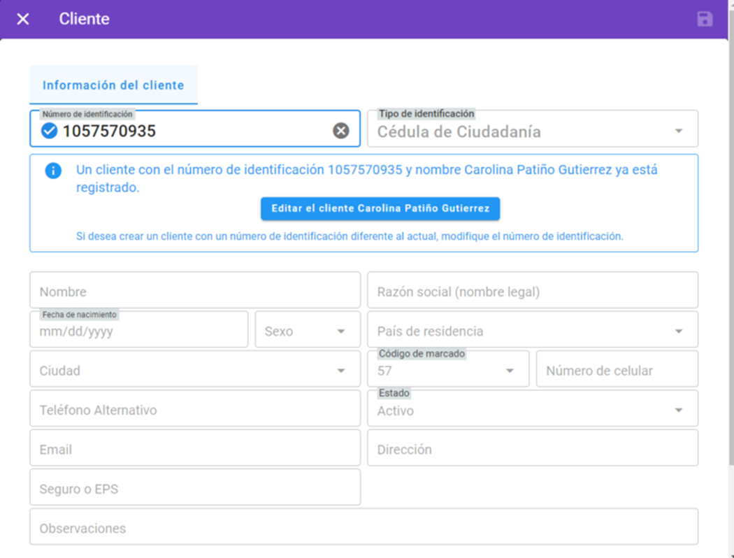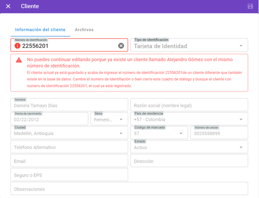 Al crear un nuevo cliente, se verifica si el cliente ya existe en el momento de ingresar el n煤mero de documento. Asimismo, al modificar un cliente ya registrado, el sistema verificar谩 si el documento de identificaci贸n ingresado pertenece a un cliente existente. Esto previene la duplicidad de informaci贸n y errores de diligenciamiento.